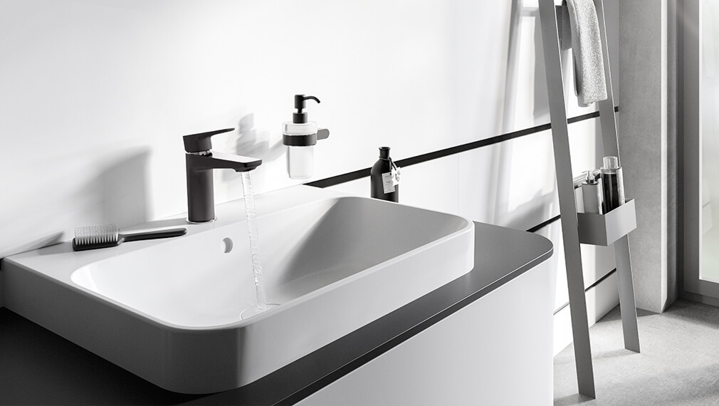 The Algeo line, loved by users, has been expanded with a black version – Algeo Black. The classic form, the flat handle, slightly narrowing to the center, is a universal design easily adaptable to any interior. Delicate chrome details enliven its simple form and add charm. The Algeo Black bathroom mixers available in a fashionable black finish are the perfect start to your bathroom furnishings. Wall patterns and textures can then be selected according to our taste and needs.